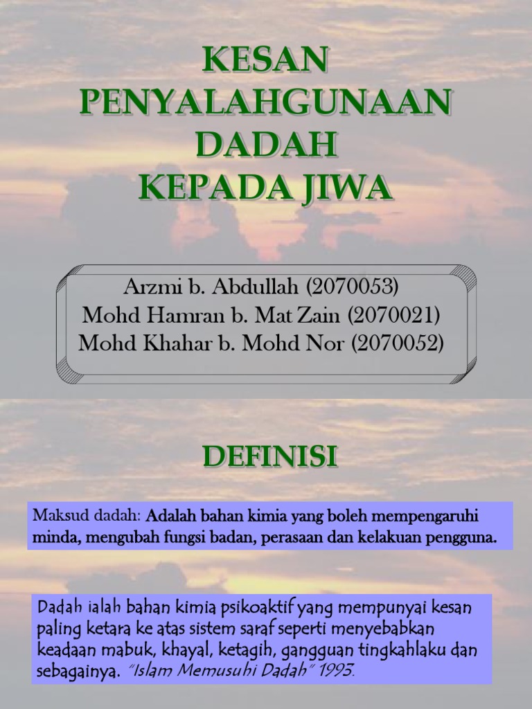 Kesan penyalahgunaan dadah terhadap kesihatan dadah. Masa yang dihabiskan untuk mencari, menggunakan dan memulihkan semula daripadanya boleh dihabiskan demi pembelajaran kemahiran baru untuk memajukan kerjaya anda. Kebanyakan penagih dadah merupakan golongan belia berumur di antara 18 kejadian penyakit h.i.v./aids juga bertambah ketara disebabkan masalah penyalahgunaan dadah. Dalam pergantungan fisiologi, ia menjadikan pemikiran, emosi dan. Nurfaradilla aina bt pilus noor azura bt norizan nur farridatul asyura bt mohd faizal disediakan kepada :