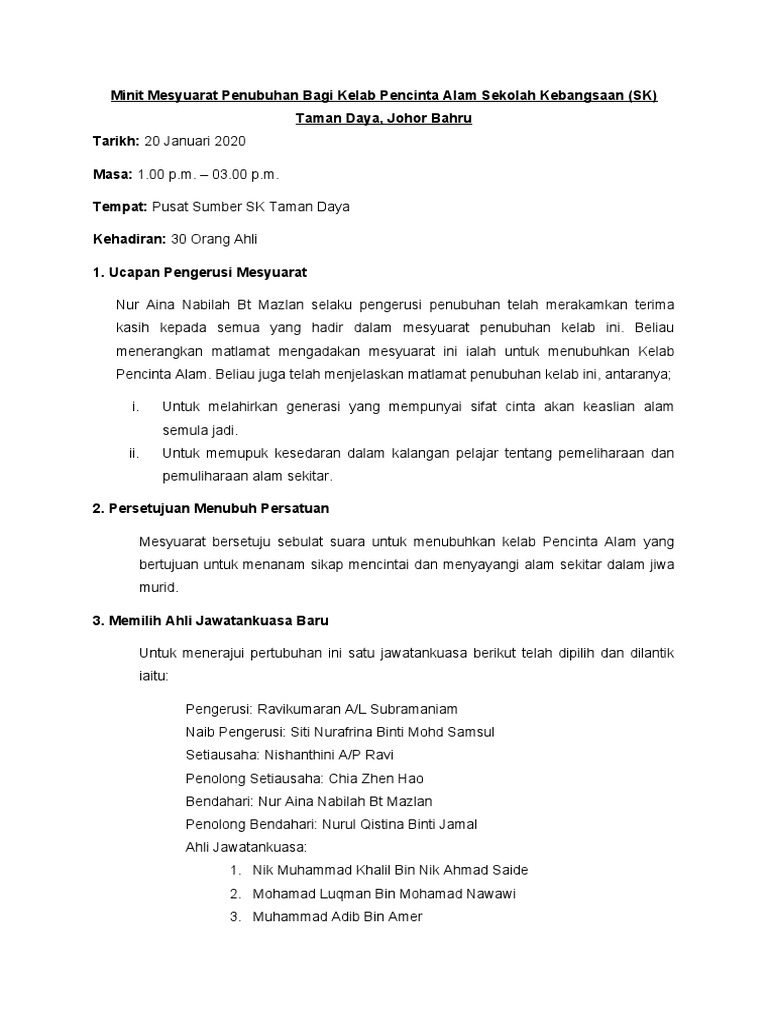 Contoh yang dikongsikan kami juga merupakan minit mesyuarat yang selaras dengan garis panduan kementerian pendidikan malaysia. 27 september 2015 masa : Minit mesyuarat penaja penubuhan kelab bola sepak. Nan aswanira bt hassan (tahun 6p)agenda 1: Documents similar to contoh minit mesyuarat penubuhan persatuan. Contoh minit mesyuarat ajk persatuan bahasa melayu. Beliau menerangkan matlamat mengadakan mesyuarat ini untuk menubuhkan sebuah persatuan bagi peminat dan penternak arnab. Minit mesyuarat, pengajian bahasa melayu. Contoh minit mesyuarat persatuan / kelab. Minit mesyuarat penubuhan by panglima hitam 14839 views. Paper memudahkan tugas mengambil nota mesyuarat, memberikan tugasan, membina idea kreatif dan menguruskan projek. Mesyuarat yang sah harus dihadiri dengan sebilangan ahli pertubuhan berkenaan seperti mana diperuntukan. 2.0 pengesahan minit mesyuarat yang lalu tiada.