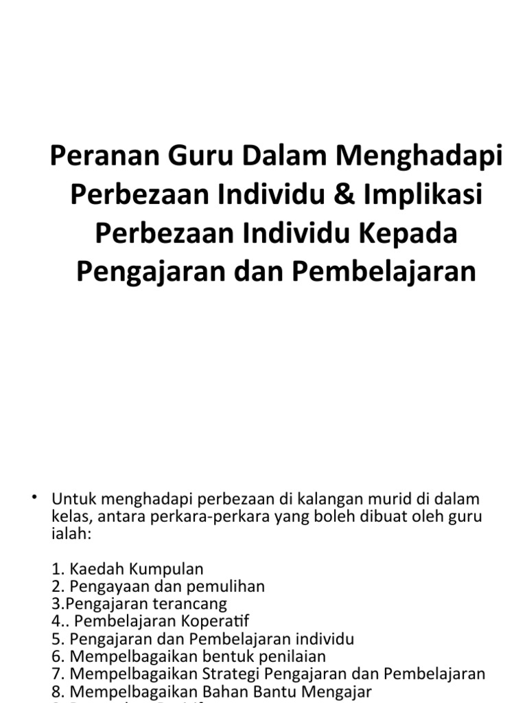 Implikasi perbezaan individu kepada pengajaran dan pembelajaran. .kelas.perbezaan individu ini akan membawa kesan kepada gaya dan corak pembelajaran mereka.demi mencapai objektif pengajaran dan pembelajaran, guru berperanan memahami dan mengenali setiap jenis murid di dalam kelas. Menurut smith, konsep diri adalah evaluasi yang dilakukan individu terhadap kemampuan dan kelemahan yang. Ialah keadaan yang perlu dihadapi oleh pengajar mengenai penerimaan pelatih terhadap kaedah pembelajaran dan pengajarannya. Implikasi perbezaan individu terhadap pengajaran dan.
