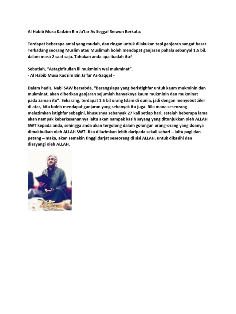 Katanya awal pagi kita hendaklah mohon ampun pada allah. Teks arab tulisan allahummagfir lil muslimiina wal muslimaat wal mu'miniina wal mukminaat al ahyaa'i minhum wal amwaat innaka samii'un qoriibun mujiibud da'waat. Astaghfirullah lil mukminina wal mukminat 27x kita jadikan amalan setiap hari sebelum waku subuh. Mohon sungguh2 supaya allah ampunkan dosa smlm, dosa kelmarin dan dosa dulu2. Dapat milyaran per hari mau baca astaghfirullah lil mukminina wal mukminat.
