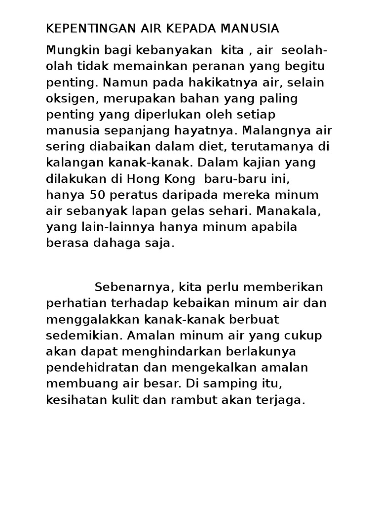 Mereka sangat bergantung kepada sungai untuk bergerak. Apakah yang dimaksudkan dengan konsep kemarau/kurangan air. Contoh karangan upsr kegunaan air kepada manusia. Kepentingan air kepada badan manusia tidak hanya dari segi kesihatan tetapi ia juga mampu menjaga ketrampilan diri seseorang. Walaupun manusia dan ekonomi memerlukan air, kelangsungan hidup alam sekitar bergantung sepenuhnya pada air. Air merupakan sumber minuman kepada manusia untuk meneruskan hidup. Kandungan air dalam otak 74%, otot 75%, darah 82%, tulang 22%, gigi 5%, hati 69% dan buah pinggang 82%. Sebaiknya, air mula diminum pada awal pagi ketika perut masih kosong untuk melancarkan lagi proses pembuangan toksin dalam tubuh badan. Perubahan guna tanah selama beberapa dekad yang lalu telah menyebabkan perubahan teruk pada corak cuaca yang seterusnya menyebabkan perubahan kepada jaminan bekalan air mentah serta peningkatan kebakaran tanah gambut dan kejadian banjir. Sambutan ini adalah bertujuan untuk menandakan kepentingan air kepada tamadun manusia dan alam sekitar. Garam mineral seperti kalsium, magnesium, kalium, kromium, selenium, natrium. Contohnya masyarakat yang tinggal di pedalaman sarawak. Menurut kajian yang dibuat oleh jabatan makanan dan dadah (fda), amerika syarikat pada tahun 2012, air mineral boleh membuang toksin yang mampu memberi kesan bahaya kepada tubuh.